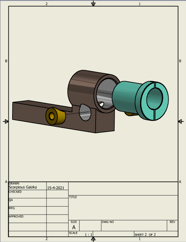 Hier heb ik een Fixeerblok gemaakt. Hier hebben we geoefend hoe je een arcering kan maken in de werktekeningen om onderdelen duidelijker te maken. Dit is vooral handig als je meerdere onderdelen moet neerzetten van je samenstelling.