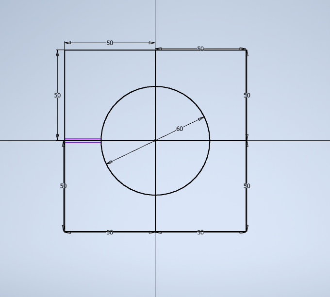 Het belangrijkste is om een schets te maken van het blokje, het makkelijkste is van de zijkant. Als u een schets maakt, druk op de zijde waar u het wil maken. Dan is het handigst om in het midden te beginnen van de schets. (Inventor geeft dat aan met een bolletje met vier lijnen die ernaar toe gaan.) Dus dan maak u via het midden 4 vierkanten van 50 bij 50 millimeter. Want dan kan u een cirkel maken van 60 millimeter die precies in het midden van je blok ligt. Dat moet u wel op het bolletje drukken, 60 millimeter invullen en op enter drukken. Wat u daarna doet is het tekenen van het gleufje. Wat ik nog gedaan heb is de overbodige lijnen die in me schets staan weggehaald. Ik bedoel bij de 4 vierkanten. (Druk dan op ''Trim'') Want het moet uiteindelijk een 100 bij 100 millimeter vierkant worden. (Zie figuur 2) Dat maakt het ook makkelijker als u gaat ''Extrude''. Als u de overbodige lijnen weg heb gehaald, dat druk u op ''finish sketch''. En dan druk u op ''Extrude'', druk u op uw schets en typ je 25mm in. Druk dan op enter. En dan heeft u een blokje van 100 bij 100 bij 25 millimeter. (Zie figuur 1)