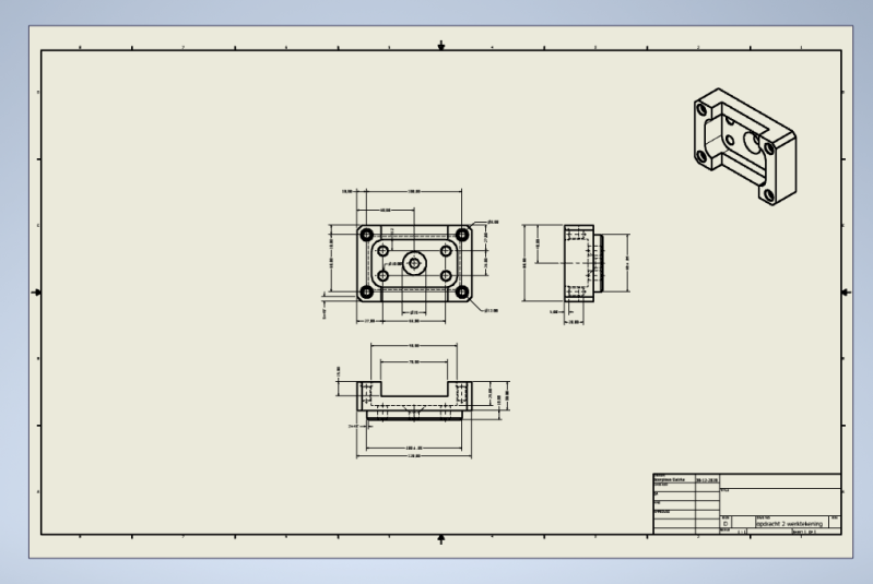 Vervolgens klik je op ''file'' aan, vervolgens ''new'' ,dan op ''drawing'' en dan op ''A size...'' Nu gaan we een werktekening maken van het 3d model wat je net gemaakt hebt. Als je de werktekening hebt, dan druk je op ''base''. Druk niet op enter! Maak dan dezelfde aanzichten als figuur 6. Als dat klaar is ga je naar ''annotate'' en kies je ''centerline bisector'' Ga dan naar de vooraanzicht en klik dan de linker en de rechter lijn aan. Doe dit bij alle gaten in die aanzicht. Nu krijg je hartlijnen. Sommige lijnen moet je handmatig langer maken. Dat kan je doen om je muis op de lijn te doen en het bolletje te pakken en dan langer trekken. Ga dan naar het bovenaanzicht en druk dan op ''center mark'' en druk dan op alle gaten in het bovenaanzicht. Druk dan op enter/ok en dan ga je de lijnen van de buitenste gaten in het bovenaanzicht met elkaar verbinden. Als je je muis op de lijn houdt, dan zie je een groene bolletje en dan kan je die lijn verlengen. (Zie afbeelding 13 hoe het eruit moet gaan zien.) Let wel op dat ik een horizontale A4 heb gepakt! We gebruiken nu de verticale A4. Het gaat om de afmetingen. Vul dan alle maten in zoals in afbeelding 13. Als je klaar bent, vergeet het niet om op te slaan!
