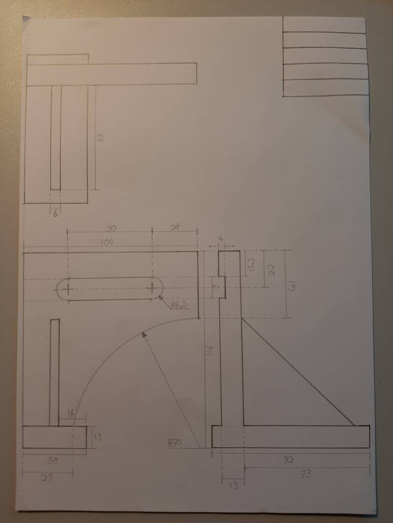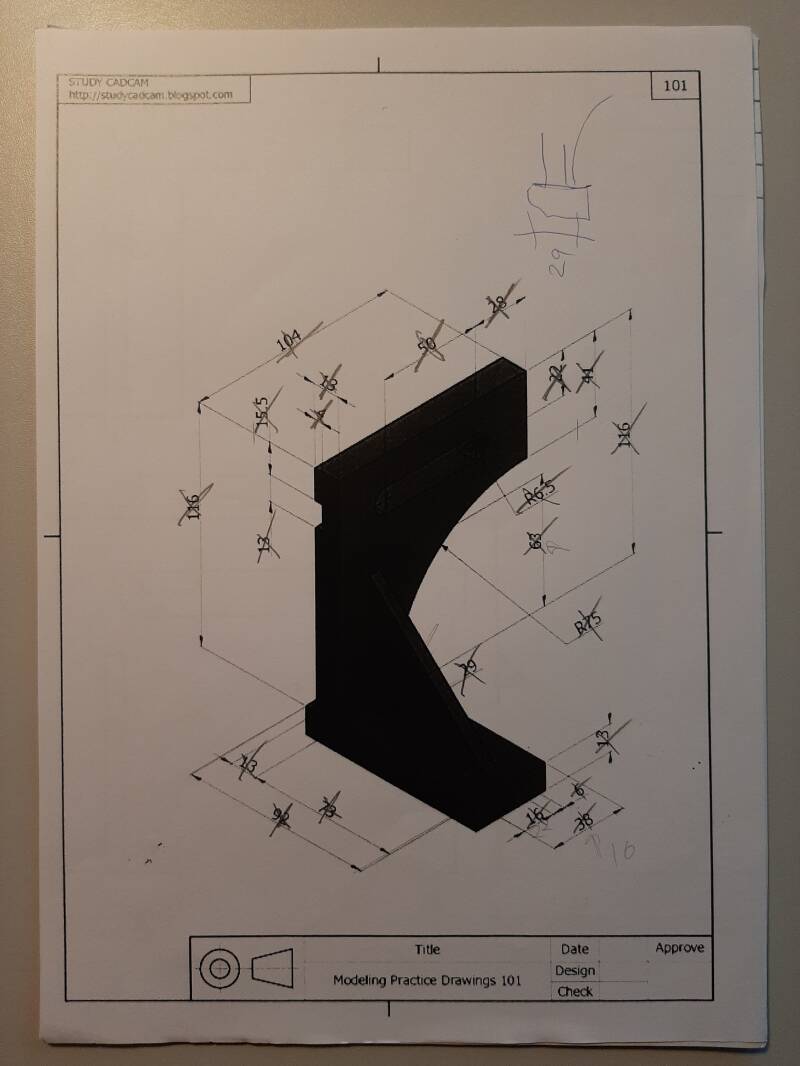 Hier hebben wij met potlood een werktekening getekend. Hierbij kregen wij een werktekening van Inventor en moesten wij dit natekenen met de hand. Met de belangrijkste aanzichten en maten. Afbeelding 4 is het model die we moesten natekenen en afbeelding 5 is mijn tekening.