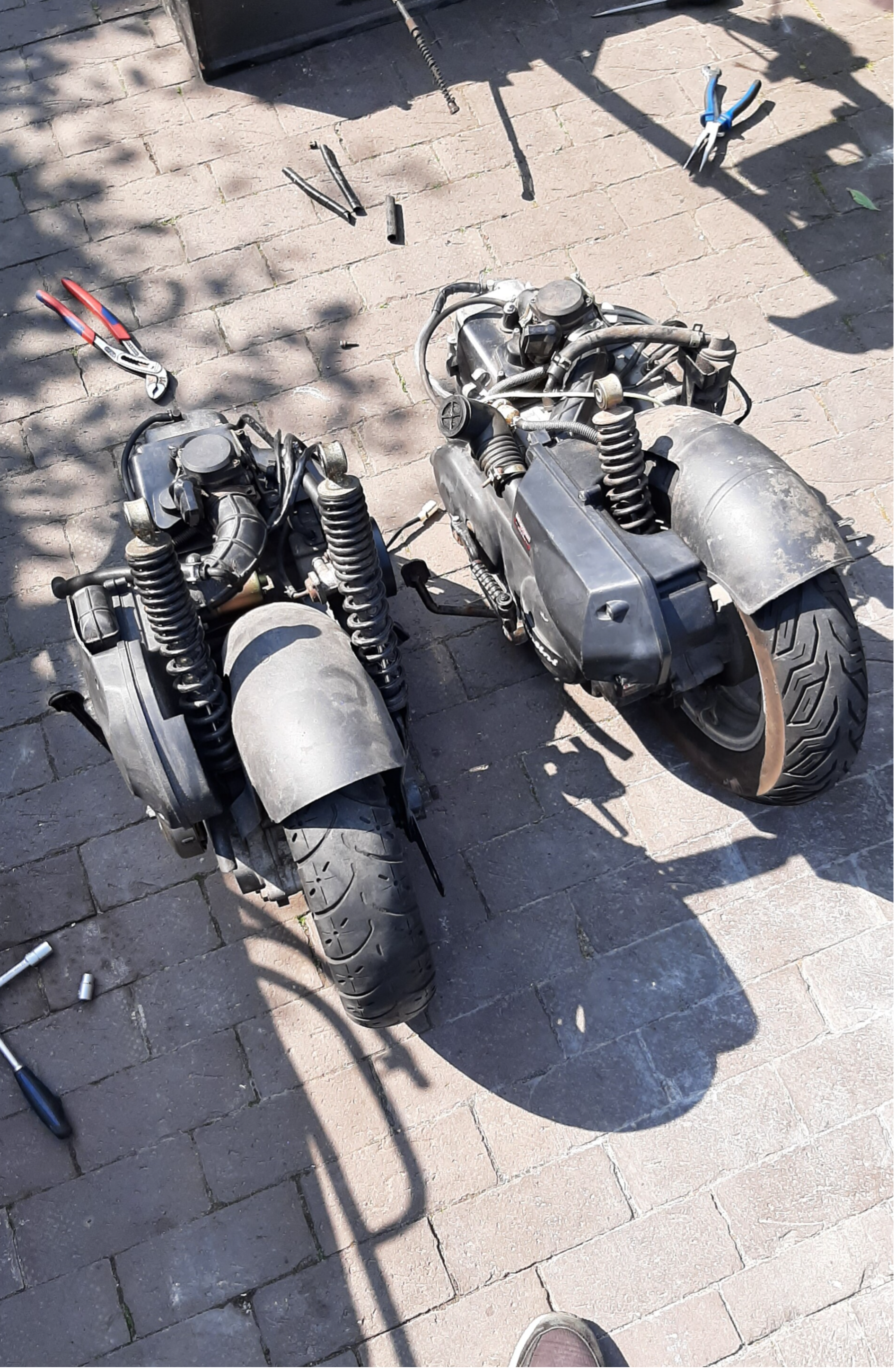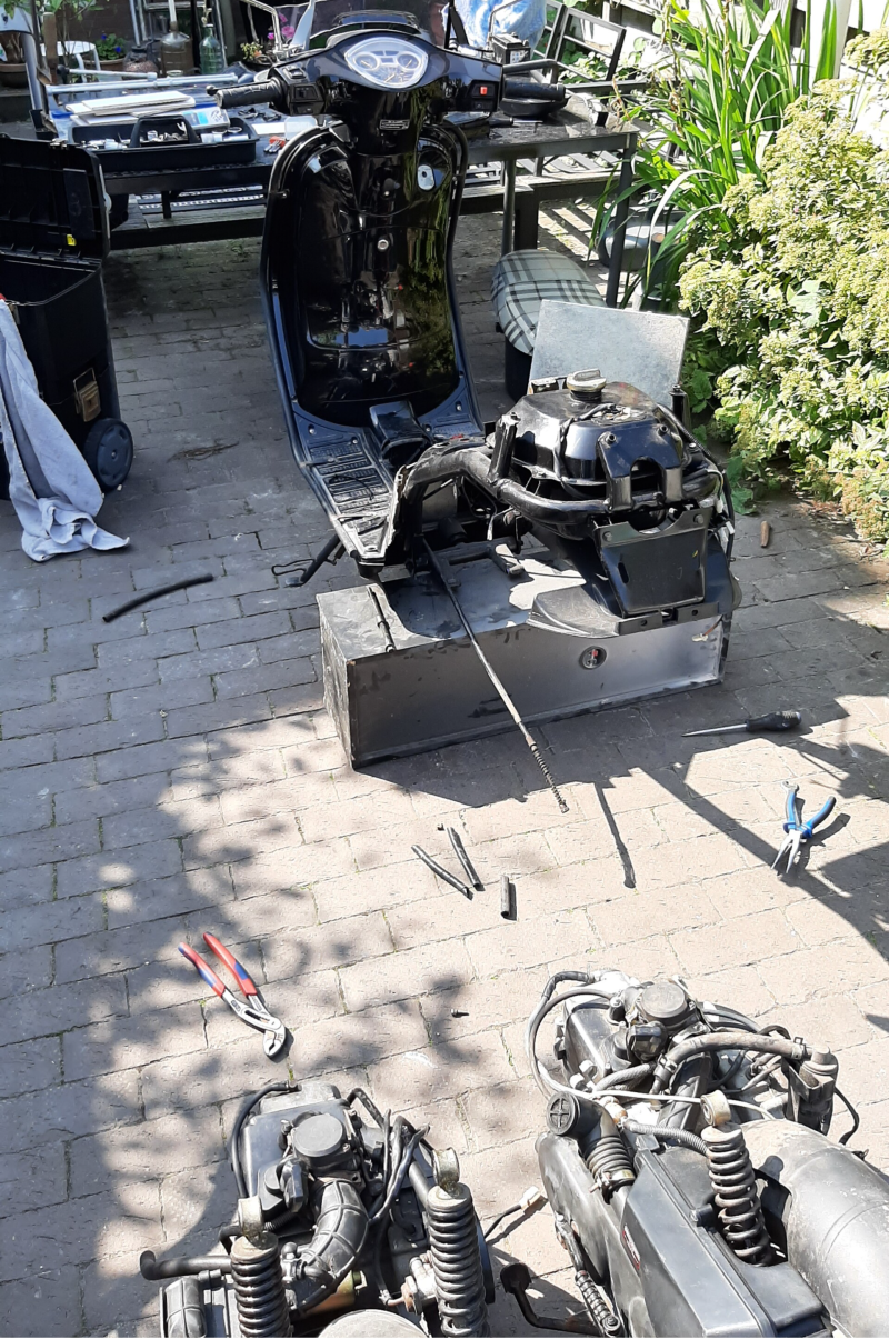 De swap ging wel redelijk snel, namelijk in een dag gedaan. Natuurlijk gaat het nooit zo soepel als je wilt. Het is een Chinese scooter dus soms moet je de gehele scooter slopen om ergens bij te kunnen. Dus de kappen en de rekken achter moesten weg. Vervolgens koppel je alle elektronica wat van de motor af komt los en haal je daarna de achter veren weg. Dit model heeft achter twee veren wat ik nog nooit had gezien. Vervolgens haal je de motorsteunpennen die het frame in gaan los en kan je het blok er vanaf halen. (Zie afbeelding 1) Ik had de blokken naast elkaar gezet om dingen over te zetten zoals het luchtfilter, de juiste veer en het wiel. Ik heb de emissie/EGR systeem weg gehaald voor meer vermogen en minder vacuüm verlies.