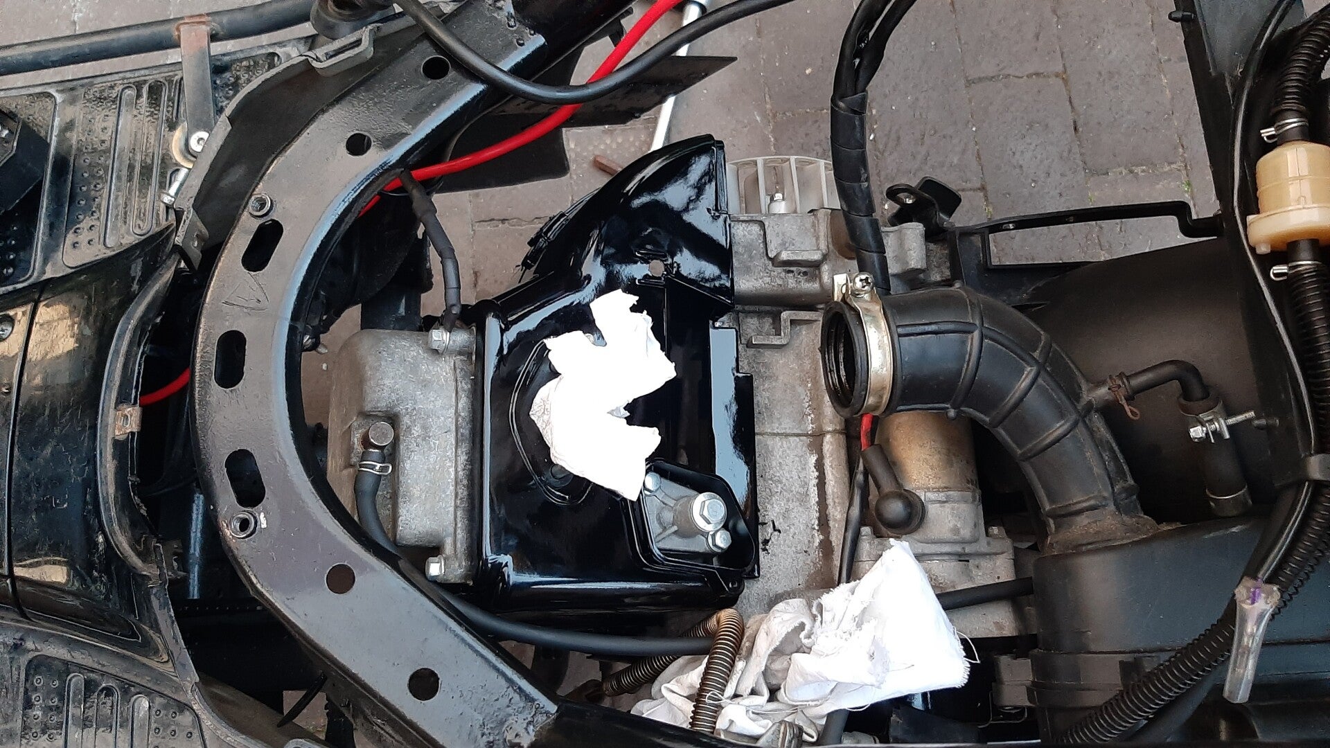 Vervolgens heb ik van de motor de kappen eraf gehaald. (Zie afbeelding 7) Ik had een doekje in de inlaat gestopt om te voorkomen dat er viezigheid in de inlaat komt want dan heb ik een groot probleem. Vervolgens had ik de nieuwe gespoten kappen gemonteerd en rustig de scooter weer opgebouwd. Zie afbeelding 13 en 14 voor het eindresultaat.