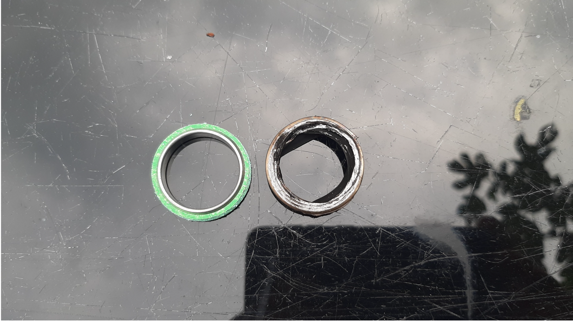 Tijdens het monteren van de uitlaat kwam ik erachter dat de pakking op was. Helemaal plat gedrukt. (Zie afbeelding 15)Dus hiervoor moest ik een nieuwe bestellen. Maar dat kon niet verzonden worden omdat de het te duur was om verzonden te worden. Dus had ik maar een kickstartpakking en een oliefilter bij besteld. Moesten ook vervangen worden.