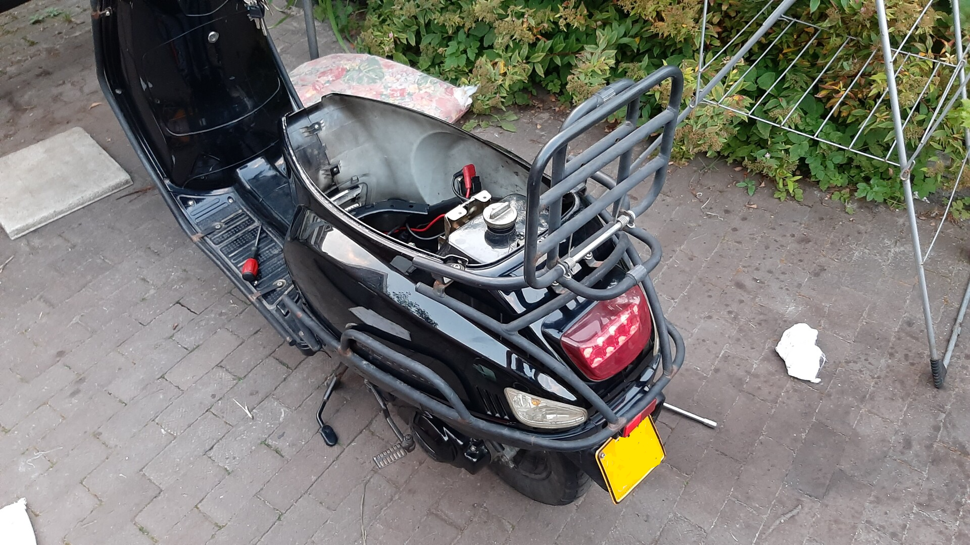 Hier heb ik een motor overgezet. Het motorblok (genaamd gy6 -> 139qmb) wat er eerst onder zat was ik niet tevreden mee. Maakte rare geluiden, was best wel traag en reageerde niet lekker. En ik had de scooter bleek er bij het olie verversen maar 3 droppels olie in het blok te zitten. Dat vertrouwde ik niet want je weet nooit hoe lang de vorige eigenaar heeft gereden met 3 droppels olie. Een blok zonder olie loopt binnen een minuut vast. Vooral bij grote motoren. Deze gebruiken namelijk glijlagers. Hier moet een laagje olie tussen zitten voor de smeering. Als dit niet zo het geval is schraapt metaal op metaal en loopt het blok namelijk snel vast. In de handleiding van de gy6 139qmb blok moet je om elke 2000km de olie verversen.
