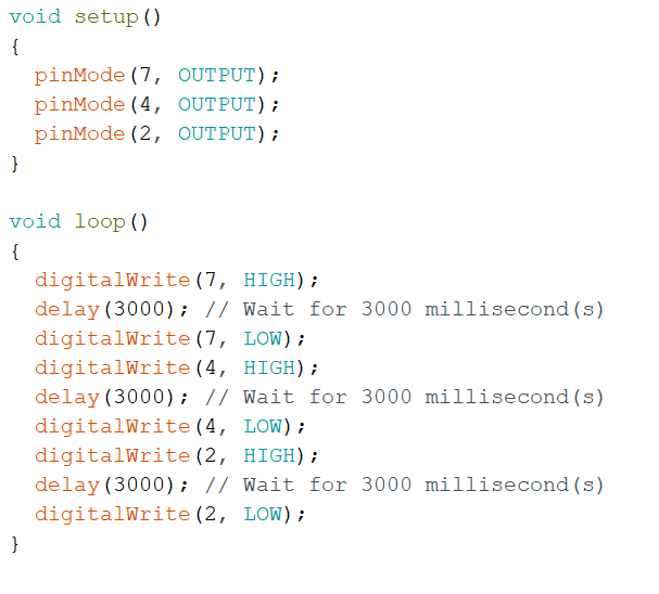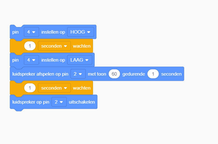 Hier gebruik je een herleidende code van opdracht 1. Maar hier gebruik je alleen de LED lampjes. Dus je zet de Rode LED aan. (pin 7) Wacht 3 seconden, zet de rode LED weer uit en de Oranje LED aan. (pin 4) Dan 3 seconden wachten. En als laatste zet je de oranje LED weer uit en de groene LED zet je dan aan. Let hierbij op dat je de andere LED weer uit zet. Anders gaan bijvoorbeeld rood en oranje tegelijk branden. Dan moet je een blauwe blok hebben. Voorbeeld: (Pin ''7'' instellen op ''Laag'') en (Pin ''4'' instellen op ''Hoog'')