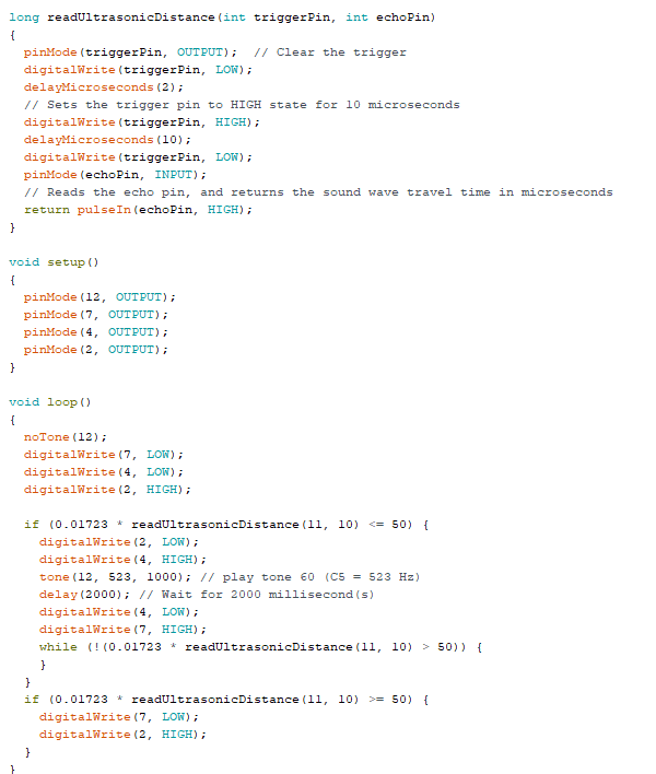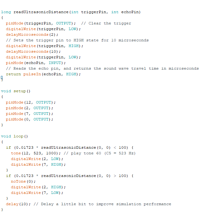 Hier heb ik een stoplicht aangesloten aan een Sonar sensor. Als de Sonar sensor detecteert dat iets dichterbij is dan 100cm, dan gaat het stoplicht op rood en gaat de piëzo piepen. Voor de auto's gaat het stoplicht op rood en vervolgens gaat het stoplicht voor de boot op rood. Als iets verder dan 100cm is, dan gaat het stoplicht op groen voor de auto's en voor de boot op rood. Hier is de Hold fuctie niet gebruikt. Je kunt dan in het filmpje zien dat de oranje LED niet brand na groen. Als ik dat wel wou, dan gaat de stoplicht tussen oranje en groen knipperen. Dat komt doordat Tinkercad in void loop staat ingesteld, dus hij leest van boven naar beneden wat er in het oranje blokje staat.